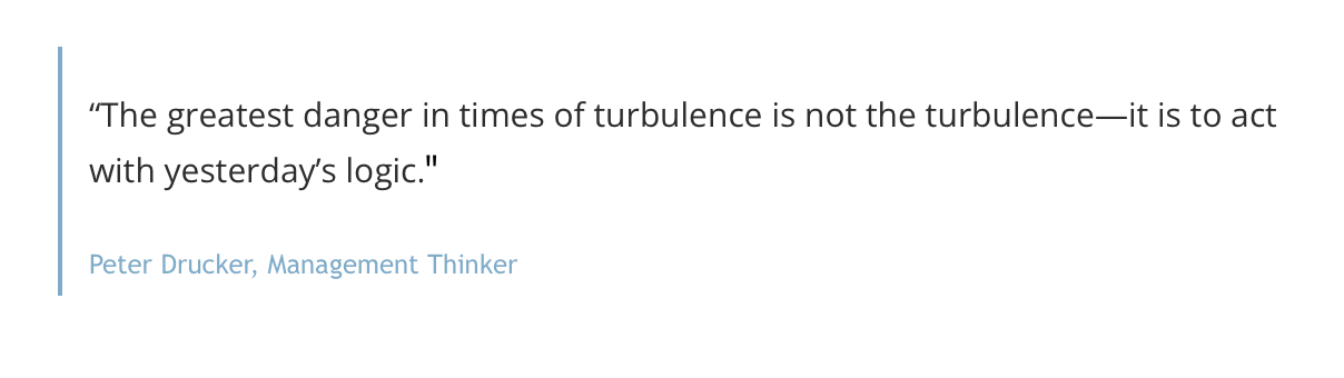 Famous management thinker Peter Drucker warns, “The greatest danger in turbulent times is not the turbulence- it is to act with yesterday’s logic.”